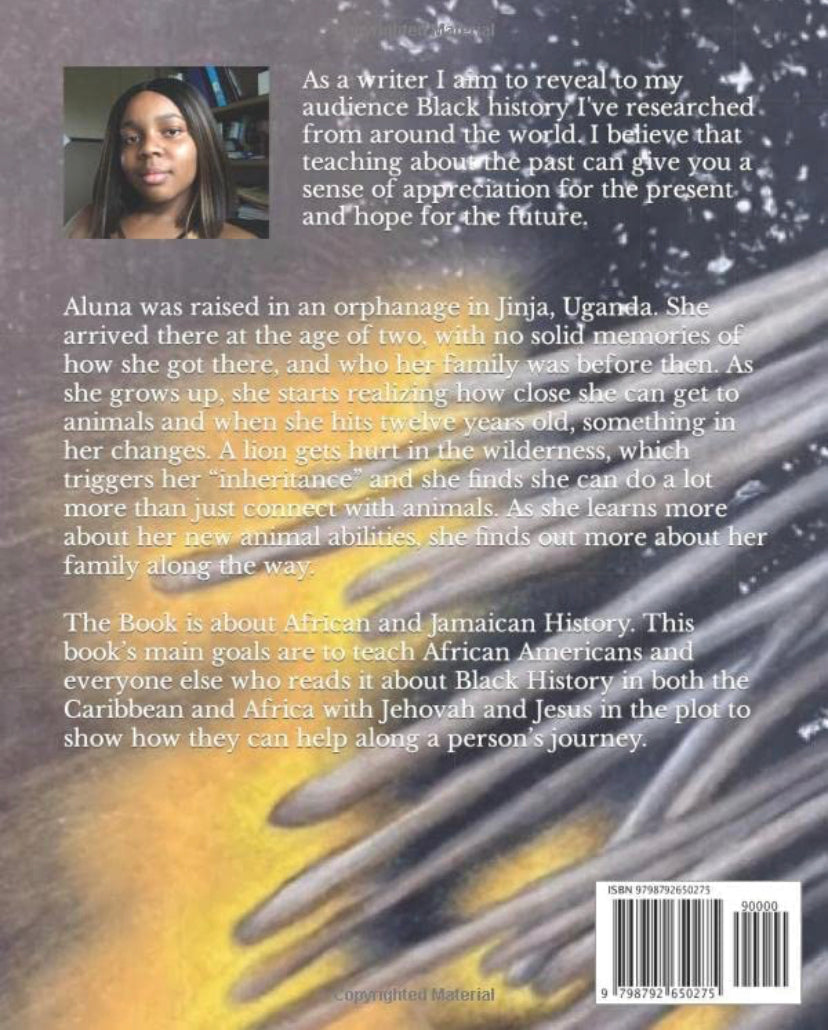 A girl named Aluna who was raised in an orphanage in Jinja, Uganda. She arrived there at the age of two, with no solid memories of how she got there, and who her family is. As she grows up she starts realizing how close she can get to animals and when she hits twelve years old, something in her changes. A lion gets hurt in the wilderness, which triggers her “inheritance” and she finds she can do much more than connect with animals. As she learns more about her new animal abilities, she learns more about her family.